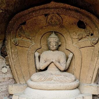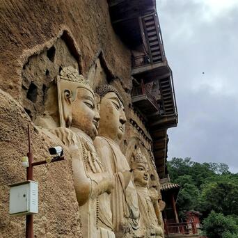麦积山石窟位于甘肃省天水市麦积区东南约30公里的群山之中,因“形如农家积麦之状”而得名,相对高度142米,海拔1742米。